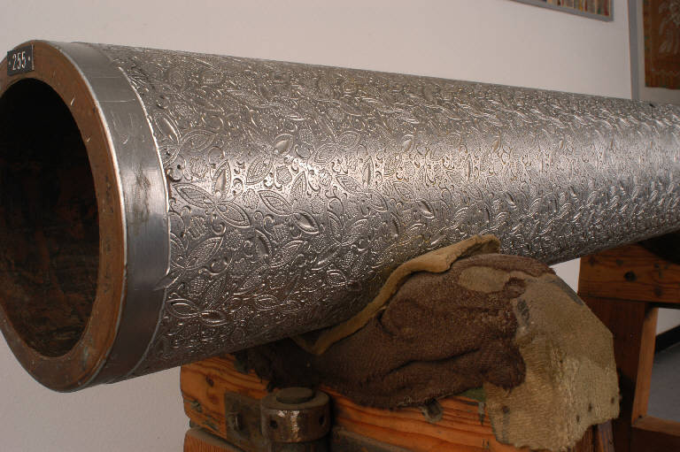 Cilindro in rame nichelato, con incisione ad alto rilievo a motivo cachemire