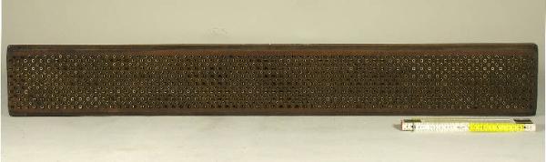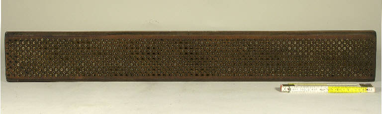 L'oggetto è costituito da una robusta tavoletta di legno in cui sono stati inseriti elementi realizzati in ottone, a formare un motivo geometrico