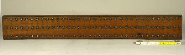 L'oggetto è costituito da una robusta tavoletta di legno in cui sono stati inseriti elementi realizzati in ottone, a formare un motivo geometrico
