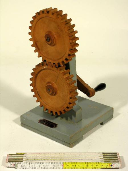 L'oggetto è un modellino didattico in legno verniciato che illustra la trasmissione parallela di un moto continuo tramite pulegge dentate a denti rettilinei. Etichetta metallica: "G. Costa e Giraudo - Modellatori - Torino"