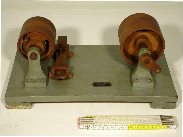 L'oggetto è un modellino didattico in legno verniciato che illustra la trasmissione parallela di un moto continuo, nella stessa direzione ed in direzione opposta rispetto a quello della puleggia motrice. A destra la puleggia piana che tramette il suo movimento tramite una cinghia. A sinistra una successione di tre pulegge: la prima con movimento a folle; la seconda trasmette il movimento nella stessa direzione (il suo asse di rotazione si prolunga in quello del movimento trasmesso); la terza in direzione opposta. Etichetta metallica: "G. Costa e Giraudo - Modellatori - Torino"