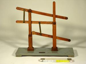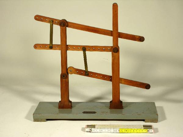 L'oggetto è un modellino didattico in legno verniciato che illustra la trasmissione di un moto alternato, con possibilità di variare l'ampiezza del moto trasmesso modificando la posizione delle briglie di collegamento fra le leve. Etichetta metallica: "G. Costa e Giraudo - Modellatori - Torino"