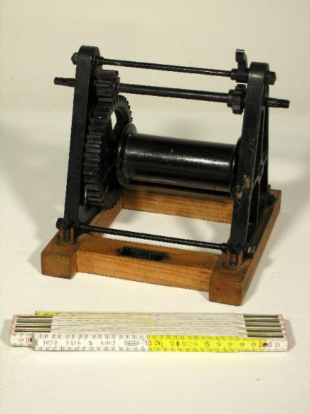 L'oggetto è un modellino didattico in legno verniciato che illustra il principio di funzionamento dell'argano: l'asse motore, azionato da una manovella (mancante) trasferisce, tramite una piccola ruota dentata coassiale, il movimento ad una ruota dentata di dimensioni maggiori, con asse coassiale ad un tamburo (su cui si avvolge la fune): il risultato è l'aumento della coppia (in base al rapporto fra il numero di denti). La rotazione motrice è unidirezionale grazie ad un meccanismo con nottolino. Etichetta metallica: "G. Costa e Giraudo - Modellatori - Torino"