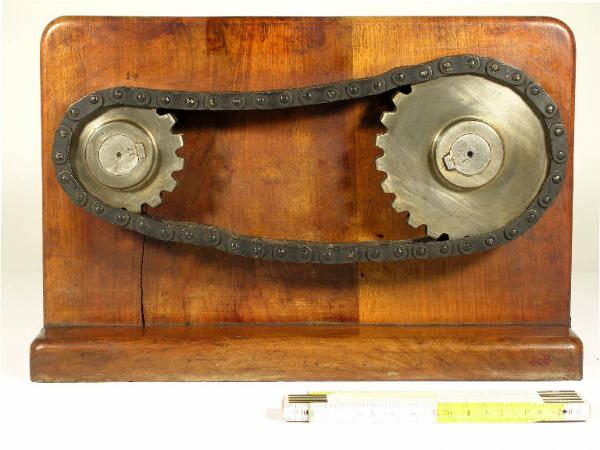 L'oggetto è un modellino didattico che illustra la trasmissione del movimento tramite catena