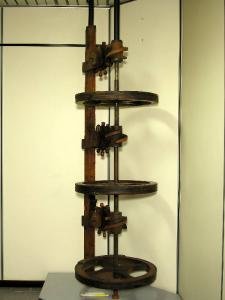 L'oggetto è il meccanismo di trasmissione di un "piantello in quadro a bacchetta" a tre valichi per la prima torsione (di filato). E' costituito da un albero in ferro che porta calettate tre pulegge piane (che nella macchina completa trasmettono il movimento di rotazione ai fusi, tramite cinghie). Sullo stesso albero sono calettate tre viti senza fine a due principi. Un ritto di legno porta tre coppie di corti bracci, ciascuno dei quali porta un alloggiamento, foderato di lamina metallica per la "bacchetta" (sulla quale, nella macchina completa, sono infilati i cilindretti di avvolgimento del filo tòrto). Fra i due braccetti è montata una ruota stellata a 10 bracci, le cui terminazioni sferiche in legno duro ingranano nei solchi della vite senza fine. Sul corto braccio che porta la ruota stellata e coassiali a questa, una per parte, due ruote dentate (le quali, nella macchina completa, trasmettono la loro rotazione ad un'altra piccola ruota calettata alla terminazione della "bacchetta").