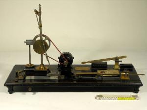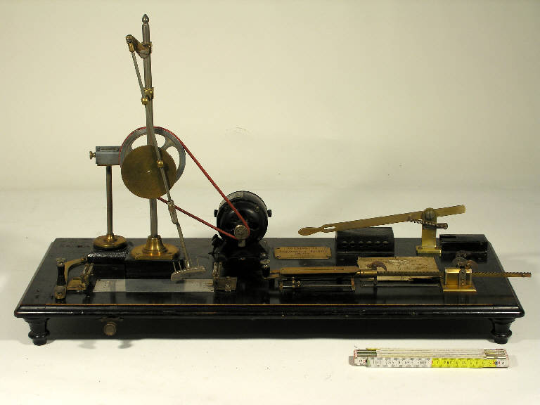 L'apparecchio è costituito da un'asta metallica collegata ad un disco rotante portato da una colonna verticale, in modo che il movimento rotatorio del disco si traduce nell'asta in movimento pendolare. Il movimento viene trasmesso al disco con una funicella da un motorino elettrico, con velocità regolabile per mezzo di una resistenza variabile (posta sul dietro, a destra e azionabile da una leva). Un interruttore permette di arrestare immediatamente il disco quando questo ha compiuto il numero di giri registrato da un apposito contagiri. L'asta metallica porta nella sua estremità inferiore organo strofinante a forma di spatola in acciaio, il quale agisce sui fili che gli vengono tesi sotto tra i due morsetti. Uno dei due morsetti è fisso, l'altro è portato da un dinamometro a scala doppia (una della tensione, l'altra dell'allungamento). Un tenditore a cremagliera permette di dare ai fili da esaminare la tensione prestabilita. La distanza fra i due morsetti è circa un terzo di metro, mentre l'organo strofinante agisce su una lunghezza di 12 cm. Tutte le parti sono montate su una tavola nera. Manca la rocchelliera con 10 rocchetti. Sul piano dello strumento è applicata una tabella scritta a macchina che riporta la classificazione delle gregge rispetto al numero medio di frizioni necessarie per lo scoesionamento delle bave: è citata la fonte, Carboni, 1947.