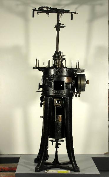 La macchina è formata da un meccanismo ad aghi per la realizzazione dell'intreccio, un supporto porta rocca in alto e un motore elettrico. Il funzionamento è manuale, azionando una manovella. Fusione: "REGINA - Brevetto 208158" Etichetta metallica: "AQUILA - Prima fabbrica italiana aghi e macchine per calze - Milano/Niguarda - "REGINA" - brevetto n° 208158 - cilindro diametro: 3 1/2 - aghi: 176 - n° di fabbricazione: 323" Etichetta metallica: "Santagostino & Maderna - Niguarda (Milano) - Apparecchio brevettato negli stati: Italia: br. n° 219-900; Germania: br. n° 407-853; Inghilterra: br. n° 217-737; Stati Uniti: br. n° ---; N° fabbr: ---"