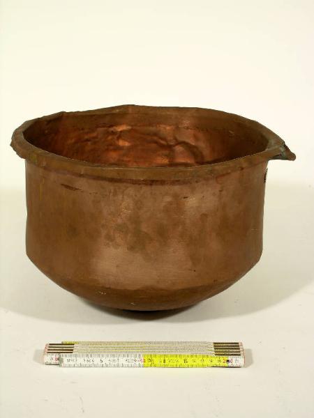 L'oggetto è una bacinella a sezione circolare, con fondo conico terminante con un foro che consente l'ingresso dell'acqua. L'oggetto era parte integrante di una macchina, artigianale, per la scopinatura e trattura del filo