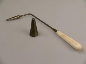 Strumento dotato di un'impugnatura di avorio a sezione ottagonale, da cui si diparte un lungo stelo piegato a novanta gradi all'estremità e terminante a goccia. Lo strumento si adatta per forma e dimensione a un cono cavo, tronco sulla punta, che aveva probabilmente un'impugnatura di legno o di osso oggi perduta.
