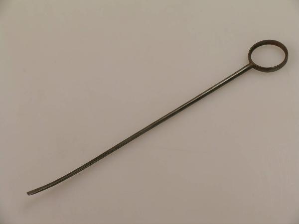 Specillo la cui punta ha la forma di una piccola spatola leggermente ricurva. L'impugnatura è costituita da un anello.