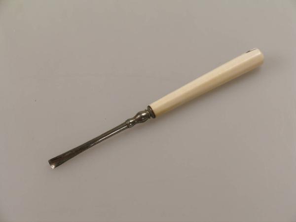 Su un manico in avorio a sezione circolare si innesta uno scalpello con l'estremità concava su uno dei lati e leggermente tagliente.