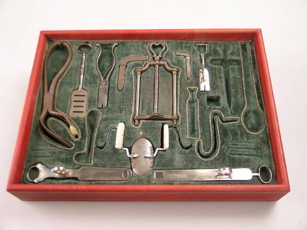 Scatola, priva di coperchio, rivestita di pelle rossa con decorazioni dorate lungo i bordi e foderata di velluto verde. In essa sono posizionati, in appositi alloggiamenti (alcuni dei quali contornati da passamaneria dorata), strumenti e accessori utilizzati in vari tipi di interventinel cavo orale.