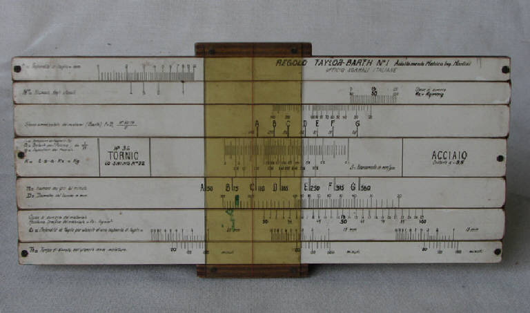 Regolo in legno costituita da una tavoletta sulla quale sono fissate tre aste di cui due alle estremità e una al centro. Tra queste si trovano altre quattro aste scorrevoli.\nSulle aste, verniciate di bianco, si trovano le scale di misura e le indicazioni dei parametri misurati: profondità di taglio, numero degli utensili, classe di durezza, sforzo ammissibile dei ruotismi, avanzamento in mm/giro del tornio, profondità di taglio per utensile con fissata capacità di taglio, tempo di durata dell'utensile senza molatura.\nLungo i lati lunghi del regolo è inserita una lastra in materiale plastico trasparente che può scorrere lungo il regolo, con stampata una riga rossa trasversale che permette la lettura della misura sulle scale (cursore).