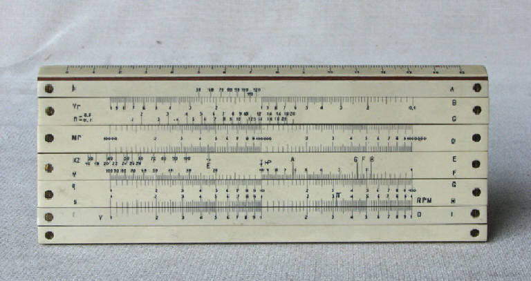 Regolo in legno ricoperto da materiale plastico bianco con serigrafate le scale di misura. Il regolo è costituito da una tavoletta con tre elementi fissi e tre cursori scorrevoli. Su ciascuno degli elementi, fissi e scorrevoli, si trovano scalde di misura con indicati i simboli e ele unità di misura delle grandezze da misurare.\nSu retro del regolo diverse tabelle indicano le velocità di taglio secondo Hülle per diversi materiali (ghisa, bronzo, ottone, alluminio, acciaio) e per diversi tipi di lavorazione (tornitura, trapano, piallatura, fresatura) ed alcuni parametri quali la resistenza alla trazione, gli avanzamenti per unità di movimento.\nSu un lato è inserito un righello per misure da 0 a 15cm.\nE' presente una custodia in cartoncino.