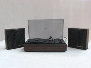 Giradischi a sviluppo orizzontale, costituito da una base in plastica dall'aspetto tipo legno e un coperchio in plastica trasparente fumé. La base poggia su quattro piedini in gomma.\nAl giradischi si collegano due casse in plastica dall'aspetto tipo legno contenenti gli altoparlanti (cofani altoparlanti).\nIl coperchio è apribile e incernierato posteriormente. Aprendo il coperchio si accede al giradischi vero e proprio e ai relativi dispositivi d'uso posizionati su un piano in plastica e metallo.\nNella parte sinistra è inserito il giradischi stereo, ad alta fedeltà, costituito da un piatto girevole in metallo, con adattatore per i dischi 45 giri, e un braccio girevole in metallo con contrappeso regolabile. All'estremità libera del braccio è inserita la puntina con trasduttore. Il braccio può essere bloccato su un apposito sostegno in metallo.\nAccanto al braccio sono presenti una levetta per l'abbassamento/sollevamento del braccio stesso, un selettore per la velocità di rotazione del piatto (33, 45, 78 giri), un selettore per l'accensione e la messa in moto del braccio girevole, un selettore per la dimensione del disco (17, 25, 30cm che corrispondono, all'incirca, ai diametro dei dischi 45, 78, 33 giri).\nNella parte destra sono inseriti i comandi di regolazione dei bassi e degli acuti di entrambe le casse e per l'inserimento del loudness.\nSotto l'apparecchio sono presenti due griglie per l'areazione e un vano contenenet il cavo di alimentazione di rete.