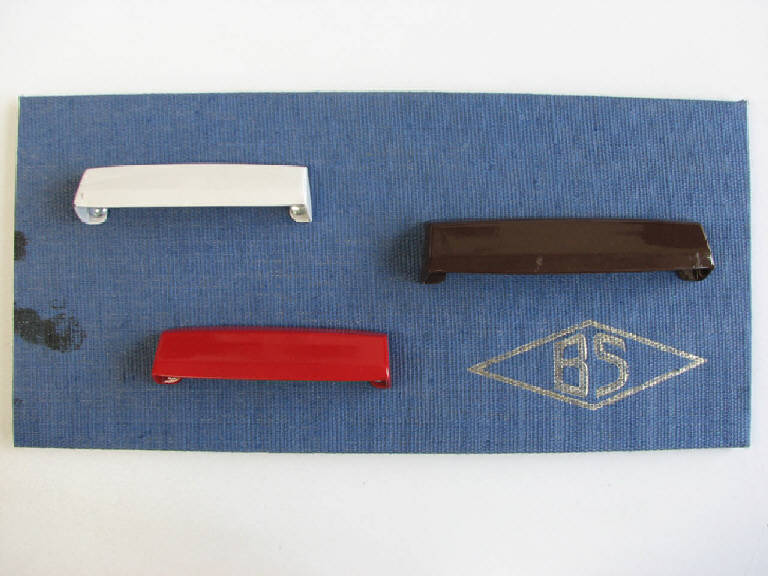 Su un pannello in legno ricoperto i tessuto blu sono fissate con due rivetti ciascuna, tre maniglie in ferro verniciato (una rossa, una bianca e una marrone).\nCiascuna maniglia è costituita da una lamina in ferro ripiegata ai baordi per permettere il fissaggio sul mobile. Il profilo della lamina è bombato.\nSul pannello è presente il marchio aziendale.