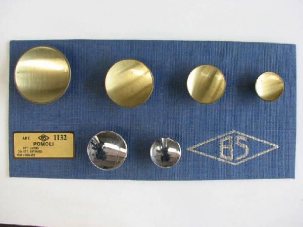 Su un pannello in legno ricoperto i tessuto blu sono fissati con delle viti, sei pomoli circolari di diversa grandezza. Quattro in ferro ricoperto in ottone spazzolato e due in ferro cromato.\nOgni pomolo ha forma svasata, con profilo frontale circolare. La superficie frontale è concava. L'interno del gambo dei pomoli è filettato per permettere l'inserimento sul mobile.\nSul pannello è presente il marchio aziendale.