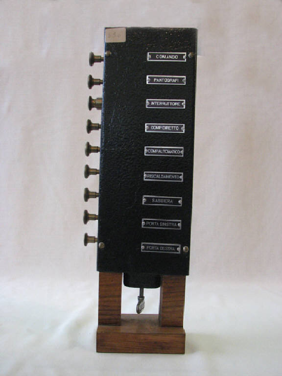 trattasi di parallelepipedo di lamiera verniciata installata sulla parete di testa sopra il banco del macchinista con il lato lungo verticale.Sulla faccia di sinistra sporgono dei pulsanti di ottone.\nSulla faccia bassa c'è una toppa per l'inserimento di una chiave.All'interno ,in corrispondenza di ogni pulsante, c'è un interruttore.