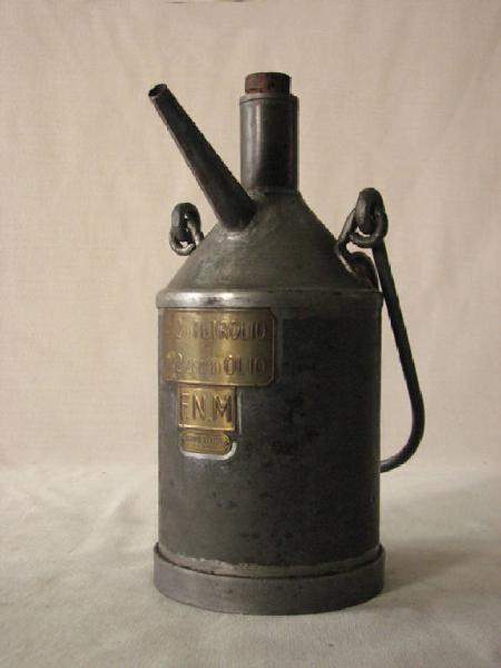 recipiente in lamiera a forma di cilindro terminante a forma di imbuto rovesciato con tappo metallico filettato.Dal corpo ad imbuto sporge un piccolo beccuccio cilindrico e 2 anelli per i ganci di una maniglia mobile per il trasporto del contenitore.Sul retro una maniglia fissa . Sul davanti n° 3 targhette in rame apposte verticalmente.La superiore con la scritta : Kg 2 petrolio e Kg 2,280 olio ;\nLa mediana con la scritta : FNM ;l'ultima con il nome del fabbricante : Olimpio Bertoni Milano.