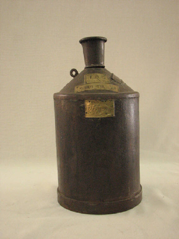 recipiente in lamiera a forma di cilindro terminante a forma di imbuto rovesciato con tappo metallico filettato.Dal corpo ad imbuto sporgono 2 anelli per i ganci di una maniglia mobile per il trasporto del contenitore.Sul retro una maniglia fissa . Sul davanti n° 2 targhette in rame apposte verticalmente.La superiore con la scritta : Ceriano FNM Kg 5 olio ; l'altra con : Colombo-Bartogi.Lattonieri Milano\nLa lamiera è tenuta chiusa da chiodatura su tutta la fiancata.