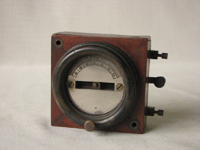 scatola quadrata in legno con inserito oblò rotondo con sottostante quadrante con al centro ago indicatore su scala 60 0 60. Sulla parte superiore due morsetti ed un anello in rame.