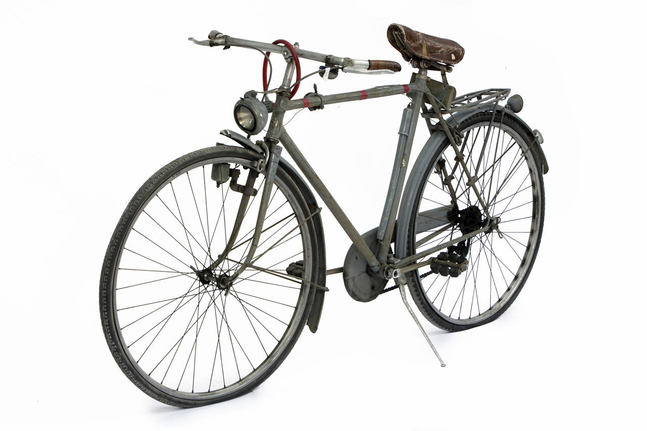 Bicicletta turistica da uomo, con telaio a trapezio in acciaio, parafanghi e carter verniciati di grigio e decorati con filettature nere. La bicicletta monta una sella molleggiata in pelle, con cannotto regolabile in altezza; sotto la sella è sistemato un borsello portaccessori. Il manubrio dritto da turismo, anch'esso regolabile in altezza, presenta le manopole in celluloide e le due leve comandanti a filo i freni a ganasce; il manubrio inoltre è accessoriato con un campanello avvisatore. Il sistema di funzionamento si basa su una trasmissione a catena sulla ruota posteriore, messa in moto da due pedali ricurvi in acciaio con sei blocchetti di gomma recanti impressa la lettera T; il sistema è stato implementato con l'applicazione di un rocchetto a tre posizioni e di un cambio a puleggia mobile, azionato da una leva posizionata sul tubo orizzontale. La bicicletta poggia su ruote con cerchi e raggi in metallo e gomme pneumatiche, dotate ognuna di 36 raggi tangenti e fissate per mezzo di dadi a galletto; sul tubo piantone è sistemata una pompa portatile originale. Sul parafango posteriore è collocato un catadiottro; in un periodo successivo la bicicletta è stata dotata di fanale anteriore e fanalino di coda, alimentati per mezzo di una dinamo applicata alla ruota anteriore; il filo elettrico per l'alimentazione del fanalino di coda è fissato sul tubo orizzontale con del nastro adesivo di colore rosso. Il veicolo infine è dotato di portapacchi posteriore, di cavalletto centrale e antifurto sulla ruota posteriore.