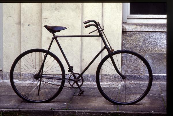 Bicicletta da uomo, sprovvista di parafanghi, con telaio a trapezio in ferro. La bicicletta monta una sella molleggiata in pelle, con cannotto regolabile in altezza. Il manubrio dritto, anch'esso regolabile in altezza, presenta le impugnature rivolte verso l'alto, con manopole costituite da nastri di tela cerata; nella parte destra del manubrio è collocata la leva che comanda a bacchetta il freno a pattino, agente sulla ruota anteriore. Nella parte anteriore del tubo di sterzo si trova il supporto portalume. Il funzionamento si basa su una trasmissione a catena sulla ruota posteriore, messa in moto da due pedali con due blocchetti di gomma nera. La bicicletta poggia su ruote con cerchi e raggi in metallo e gomme pneumatiche; la ruota anteriore presenta 28 raggi tangenti, mentre quella posteriore conta 36 raggi tangenti.