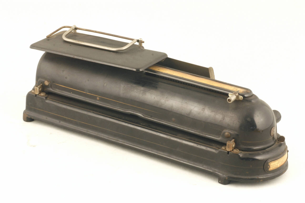 La macchina ha una struttura in metallo verniciato di nero, poggiante su quattro piedini. E' composta da una base in ghisa con lato anteriore semicircolare e da un coperchio arrotondato in metallo, sollevabile. All'estremità anteriore della base si apre un frontalino costituito da un foglio di carta iscritto, protetto da una pellicola di celluloide. Sul lato destro della macchina si trova un vassoietto cromato alzabile ed abbassabile, scorrevole su due binari orizzontali in metallo cromato, per l'alimentazione dell'assegno da compilare; nella parte anteriore del lato destro inoltre è situata l'apertura circolare per l'inserimento della manovella. Al di sopra del vassoietto è presente uno sportello apribile per l'accesso al sistema di stampa interno, costituito da un albero e un sistema di rulli inchiostrati rotanti; i caratteri si trovano su una striscia di gomma dura posizionata sulla superficie dell'albero azionato dalla manovella. Sulla sommità del coperchio è posto un indice in carta protetto da un foglio di celluloide per la selezione della valuta, delle cifre e delle unità da stampare; lungo l'indice si muove un indicatore in metallo. Nella parte posteriore della sommità della macchina, infine, è posizionato un vassoio in metallo verniciato di nero, rotante orizzontalmente, per riporre gli assegni; è dotato di un archetto cromato per bloccare gli assegni appoggiati.