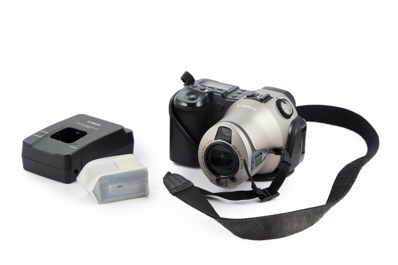 Apparecchio fotografico dal design ergonomico, in metallo e materiale plastico impermeabile.\nL'obiettivo è inserito nella parte sinistra dell'apparecchio mentre sul lato destro si trovano i dispositivi d'uso (modalità di scatto, qualità e dimensioni delle foto, ecc).\nNella parte cilindrica contenente l'obiettivo si trova il mirino ottico.\nLa parte del dorso dell'apparecchio in corrispondenza dell'obiettivo è apribile e contiene un visore LCD per la visione del soggetto da fotografare, in modalità di ripresa, o dell'immagine fotografata, in modalità di visione.\nSopra al cilindro contenente l'obiettivo si trova una slitta per l'inserzione del flash elettronico esterno e una rotella per l'impostazione del dispositivo esterno a cui è possibile collegare l'apparecchio (TV, videoregistratore, PC), sul lato sinistro si trova il comando per azionare lo zoom. Vicino alla slitta del flash è inserito un microfono per la registrazione dell'audio durante le riprese video.\nNella parte destra dell'apparecchio, superiormente, si trova un display digitale per l'indicazione dei valori impostati che possono essere selezionati mediante i pulsanti posti accanto al display stesso.\nIn particolare il pulsante "menu" permette di accedere alle impostazioni dell'apparecchio (software, informatical.)\nIn posizione più avanzata si trova il pulsante di scatto mentre sul dorso, in alto si trovano i pulsanti per modificare il contrasto.\nL'apparecchio è contenuto in una custodia in pelle apribile, avvitata sull'apparecchio stesso, con tracolla in materiale sintetico.\nSono inoltre presenti sei batterie ricaricabili, di cui due con custoidie in plastica e un carica batterie da collegare alla rete elettrica.