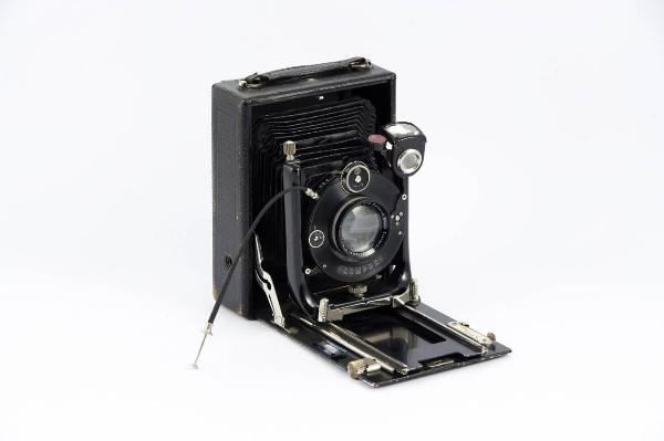 Apparecchio fotografico verticale in metallo ricoperto in pelle di forma parallelepipeda, con maniglia in pelle. E' presente una custodia in cuoio marrone con serratura di chiusura.\nLa parete frontale dell'apparecchio è incernierata nel lato inferiore. Premendo sul pulsante di sblocco posto superiormente, lo sportello anteriore, in metallo, si apre ed è possibile estrarre il soffietto in tessuto e pelle nera, libero di scorrere su una guida metallica a doppia estensione posizionata nell'interno dello sportello stesso.\nLo sportello è mantenuto aperto da due tiranti in metallo.\nIl soffietto termina con un telaio in metallo sul quale è posizionato il porta obiettivo.\nPer muovere il soffietto occorre tenere premuti due pulsanti di sblocco posti sul telaio. L'avanzamento è guidato da una rotella posta sull'interno dello sportello, in corrispondenza della guida.\nLa lettura della distanza di ripresa può avvenire rispetto ad una scala graduata fissata sull'interno dello sportello che riporta le distanze da 2 a infinito.\nL'obiettivo può scorrere verticalmente lungo due montanti in metallo posti a lato del portaobiettivo.\nAll'interno dell'obiettivo sono inseriti un diaframma iride ed un otturatore Compur.\nSotto e sopra all'obiettivo sono inserite due levette per selezionare l'apertura del diaframma a iride (da f/4,5 a f/36).\nSopra all'obiettivo una rotellina permette di selezionare la velocità di scatto dell'otturatore, da 1/150 di sec a 1 sec. Un'altra rotellina posta lateralmente sul posta obiettivo permette di selezionare la modalità di scatto: istantanea M, apertura e chiusura manuale D, posa Z (otturatore resta aperto fino a che non si scatti nuovamente).\nLa carica dell'otturatore avviene mediante una levetta posizionata sull'obiettivo, in prossimità dell'otturatore e lo scatto o attraverso una levetta posta sotto al comando della modalità di scatto o mediante uno scatto flessibile a distanza inserito nell'apposito foro.\nSulla lastra porta obiettivo è fissato anche un mirino a riflessione orientabile con livella per il corretto posizionamento dell'apparecchio.\nDalla parte opposta dell'obiettivo è inserito il porta lastra (formato 9x12cm) estraibile. Nel porta lastra è inserito un vetro smerigliato, utilizzato per l'inquadratura e la messa a fuoco, protetto da un paraluce apribile in cartone e tela.\nIl porta lastra può essere sfilato superiormente per caricare la lastra fotografica inserita nell'apposito porta lastra.\nSotto lo sportello apribile e lateralmente sono presenti due fori filettati per il posizionamento eventuale su un cavalletto.\nSono presenti due tabelle della Agfa (una in italiano e l'altra in tedesco) che permettono di valutare, da un lato, le modalità di utilizzo dell'apparecchio con lastre o pellicole Agfa a seconda del giorno, dell'ora, del tipo di lastra, del soggetto da fotografare, del tempo di posa, dell'apertura relativa del diaframma, dall'altro, la quantità di polvere lampo a seconda della sensibilità delle lastre o pellicole Agfa, delle aperture del diaframma e delle distanze tra soggetto e lampo.