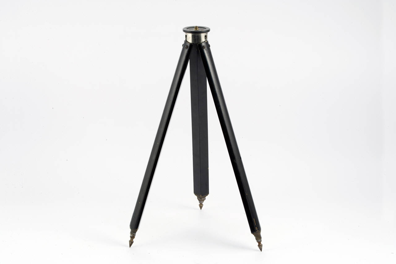 Questo treppiede per apparecchi fotografici di medie dimensioni è costituito da tre gambe in metallo allungabili, a sezione triangolare.\nCiascuna gamba è telescopica e costituita da quattro elementi inseriti uno dentro l'altro.\nDa chiuse assumono complessivamente una forma cilindrica.\nAd un'estremità le tre gambe sono incernierate ad un disco in metallo, le altre estremità terminano con piedini appuntiti in metallo.\nAl centro del disco in metallo è inserita una vite per l'inserzione dell'apparecchio fotografico.