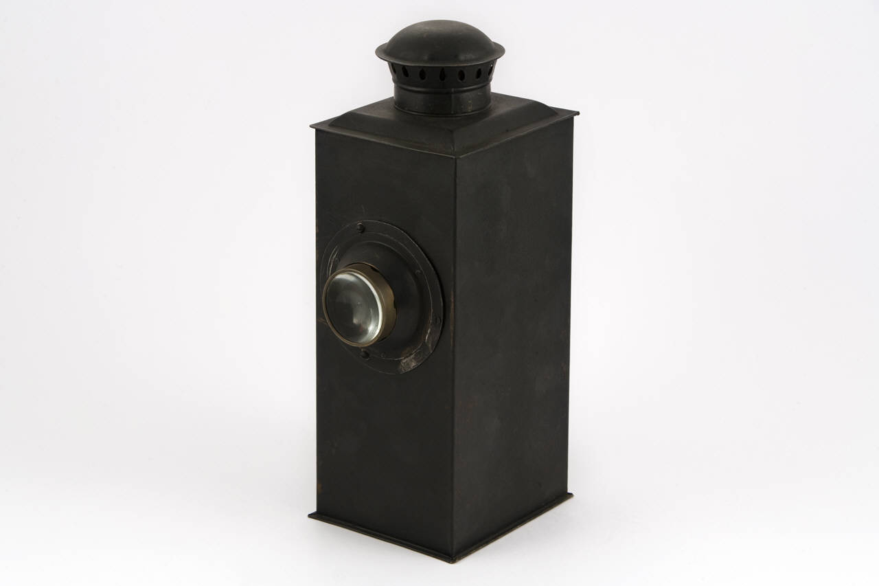 Lanterna in metallo verniciato di nero, di forma parallelepipeda con camino.\nLo sportello posteriore, incernierato nella parte alta, è apribile. All'interno è inserita una lampadina a filamento (tungsram da 130V e 25W) nell'apposito portalampada collegato con un cavo elettrico ricoperto in tessuto con spina per il collegamento alla rete elettrica. La posizione del portalampada può essere variata lungo una guida posta sul fondo, agendo su una rotella posta lateralmente sul porta lampada stesso. Sulla parete opposta a quella apribile è inserita una lente condensatrice.\nLateralmente una finestrella rossa circolare permette di vedere all'interno.