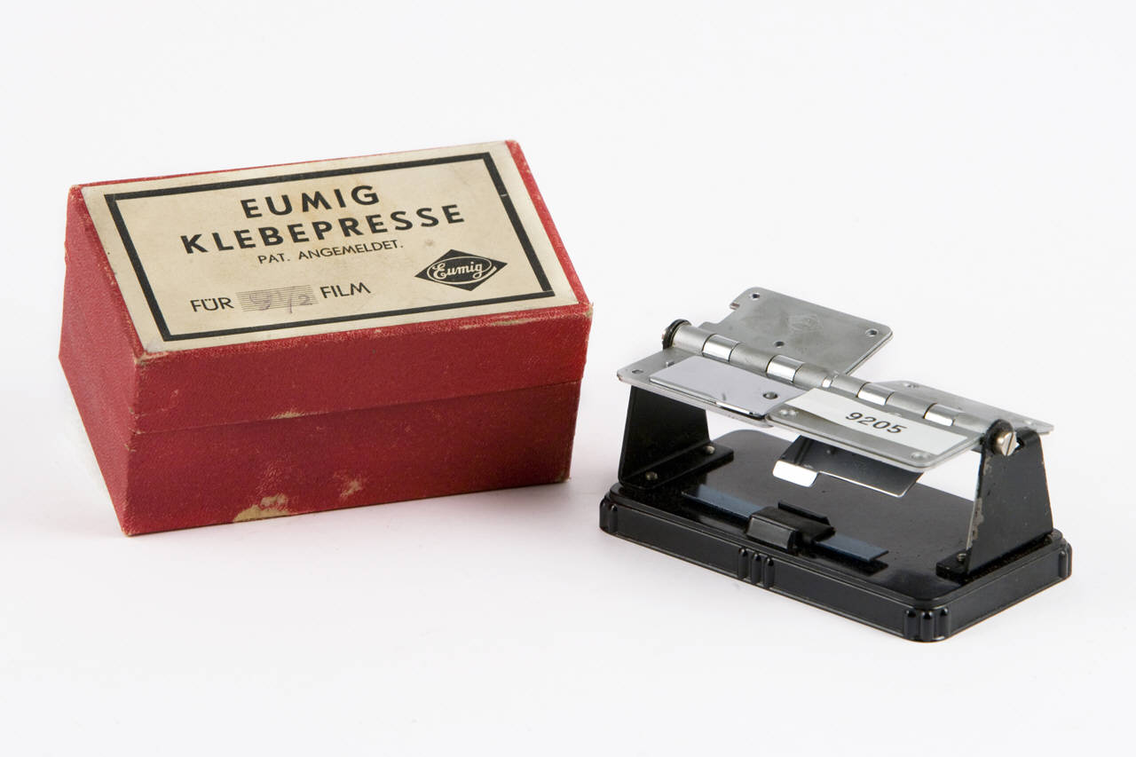 Dispositivo in metallo costituito da una base rettangolare con due montanti ai lati che sorreggono un perno longitudinale. A questo perno sono vincolate due coppie di alette reclinabili in metallo libere di ruotare di 180° a cui sono sovrapposte due placche di compressione. Sotto alle placche di compressione, sulle alette, si trovano dei dentini dove si inseriscono i fori della pellicola da 9,5mm che si vuole tagliare e incollare. Sul bordo interno dell'aletta destra è inserito un tagliente.\nLa pressa è dotata di scatola in cartone e foglio di instruzioni.