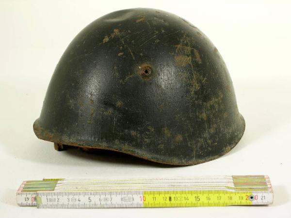 Il casco è realizzato in ferro in due parti: il guscio esterno (in ferro dello spessore di alcuni millimetri) e la sagoma interna (in lamina più sottile), foderata di tela cerata e dotata di un cinturino per il fissaggio sotto il mento. Si tratta di un elmetto di fabbricazione italiana "modello M33"