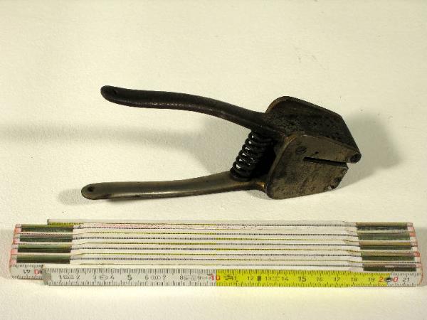 Lo strumento è costituito da una sorta di pinza in cui l'azione sui manici porta all'avanzata di una serie di aghi fino ad emergere da fori complementari che compongono le cifre "TP" (=Tintoria Pessina). La pinza possiede una molla per l'apertura dei manici.