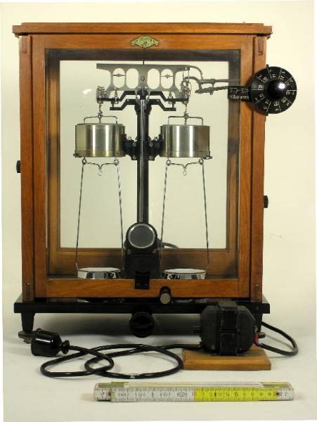 Bilancia a colonna a bracci uguali in teca: vetrina in legno di rovere e vetro, con sportello anteriore sollevabile a contrappeso, sportello laterale destro fermato con pomello e gancio e sostegno con tre piedini di cui due con viti calanti regolabili. Giogo in lega d'alluminio traforato con viti di regolazione per l'equilibrio della bilancia e del baricentro. Coltelli e piani d'appoggio in agata. Colonna in ottone verniciato nero con sistema di sollevamento del giogo a bracci articolati e di arresto dei piatti azionabile con manopola esterna. In cima alla colonna bolla di livello. Indice in lega d'alluminio riportato con corrispondente scala graduata in osso. All'estremità inferiore dell'indice, sotto l'ago, telaietto rettangolare con scala per lettura a proiezione. Sospensioni a staffa con viti di regolazione per il parallelismo e la complanarità dei coltelli. Doppio gancio per la sospensione delle campane degli smorzatori ad aria e dei piatti. Gli smorzatori sono in alluminio ed ottone con dispositivo per la regolazione dell'aria. Aste rigide composte, in ottone nichelato, con gancetto supplementare, per la sospensione dei piatti in ottone nichelato di forma rotonda a bordi ribassati. All'esterno della vetrina, sul lato destro, un meccanismo a doppia manopola coassiale per il caricamento delle masse minori (da 10 a 990 mg) azionabile dall'esterno con indice a bandiera. Sul piano è montato il meccanismo per la lettura a proiezione della scala, composto da lampada posteriore esterna e gruppo ottico con microscopio e viti per la regolazione della mesa a fuoco e dello spostamento della scala. Targhetta in alluminio sulla vetrina "Galileo Sartorius - Milano" e logo. Sulla parte frontale del giogo logo della ditta. Sulla scala dell'indice logo della ditta e testo: "Galileo Sartorius - Firenze - n°17722".