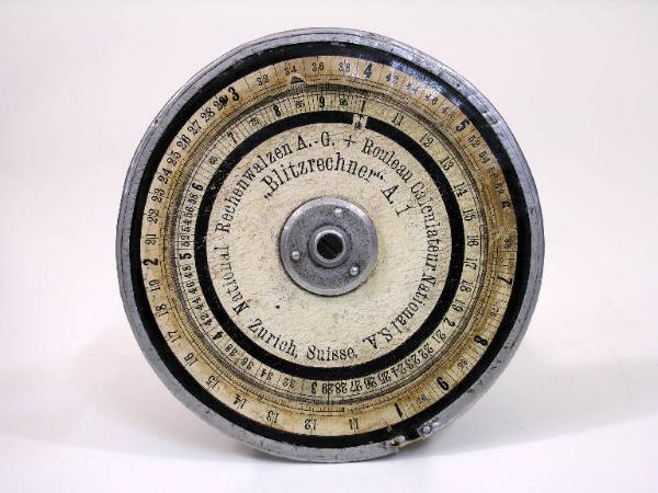 L'oggetto è costituito da due cerchi concentrici, di cui il più interno ruota intorno al perno centrale, tramite una manopola sul verso dello strumento; sul recto le cifre sono stampate su tabelle in carta incollate. Nella porzione centrale: "National Rechen Walzen A.-G. - Rouleau calculateur National S.A. - Zurich - Suisse" e "Blitzrechner A.1"