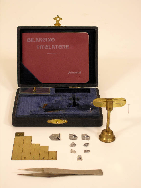 L'oggetto è costituito da una scatola di cartone con impressa in oro la scritta "Bilancino titolatore" e contenente: bilancino, istruzioni d'uso, regolo con punzonato il logo e le cifre "TIS", una pinzetta in acciaio con l'incisione corsiva "PR", una serie incompleta di 7 pesini (il corredo completo è di 10) tutti con una punzonatura a forma di corona (n°1 da 5 dg, n°2 da 2 dg, n°1 da 1 dg, n°2 da 2 cg, n°1 da 5 cg) e un pesino su cui compare "A", alloggiato in apposita sede; un vetrino fa da coperchio alla sede rettangolare dove sono raccolti i pesini. Il bilancino ha una colonna cilindrica fissata ad una base circolare, e un giogo in filo di ferro terminante con un anellino per parte, cui è sospeso un gancio aperto; il giogo è protetto, dietro, da una piastra allungata fissata alla colonna; un filo a piombo permette la messa in bolla dello strumento. Sono presenti le seguenti punzonature: stella a 5 punte sovrastata da "OG" e un punzone ovale con corona e "402".