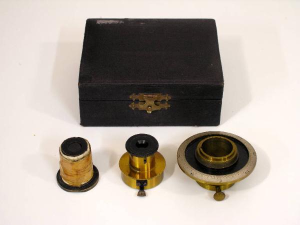 L'oggetto è costituito dai tre accessori principali di un polarimetro (del tipo Laurent?) e dalla loro custodia originale. A sinistra l'apparecchio "polarizzatore"; a destra l'apparecchio "analizzatore", con l'indice; al centro il cerchio graduato in cui si inserisce l'analizzatore e su cui scorre l'indice. Mancano il piede per il sostegno e l'assemblaggio delle parti e il canale metallico in cui alloggiare il tubo (cella, vd. INVN 000698 e 000699)
