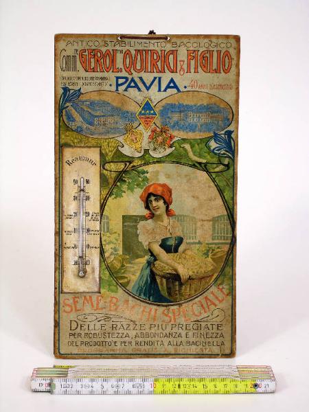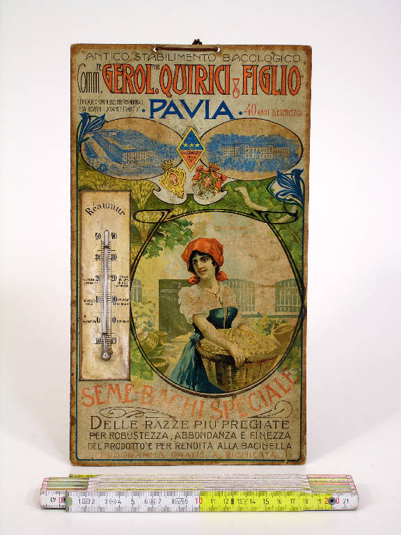 L'oggetto è un termometro ad alcool in gradi "Réaumur" applicato ad una base di cartone con funzione pubblicitaria. "Antico Stabilimento Bacologico Comm.re Gerolamo Quirici & Figlio - Pavia - Le più alte onorificenze in espos. mondiali e dai Governi italiano e francese - 40 anni d'esercizio - Seme-bachi speciale - delle razze più pregiate per robustezza, abbondanza e finezza del prodotto e per rendita alla bacinella - Programma gratis a richiesta". Il termometro è graduato da -10 a +40 gradi Réaumur, ed in corrispondenza di alcune temperature sono presenti indicazioni precise. 0 gradi: "svernatura seme-bachi"; 10 gradi: "Risveglio della attività embrionale"; 20 gradi: "massimo (per) nascita razza indigena chinese giapponese"