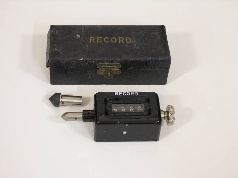 Lo strumento è costituito da un corpo in ferro verniciato di nero con una finestra anteriore per la lettura delle 4 cifre, a destra una manopola di azzeramento, a sinistra un perno rotante in acciaio, su cui si può agganciare un secondo perno con punta gommata. Lo strumento è contenuto in una scatola originale in cartone.