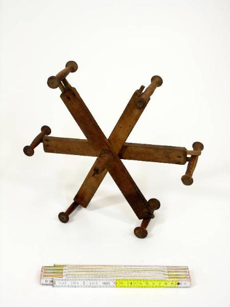Aspino a 6 raggi in legno. I raggi sono composti da una porzione fissa e una mobile: i segmenti fissi possiedono delle scanalature in cui scorre il segmento regolabile, terminante con un appoggio tornito per il sostegno della matassa