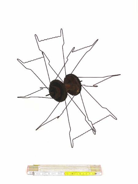 Aspino abbattibile a 8 raggi in filo metallico. 8 archi sagomati sono imperniati su una coppia di dischi con meccanismo che, se ruotato, permette l'abbattimento dell'aspino. Un perno metallico centrale permette l'appoggio dell'oggetto sul suo supporto.