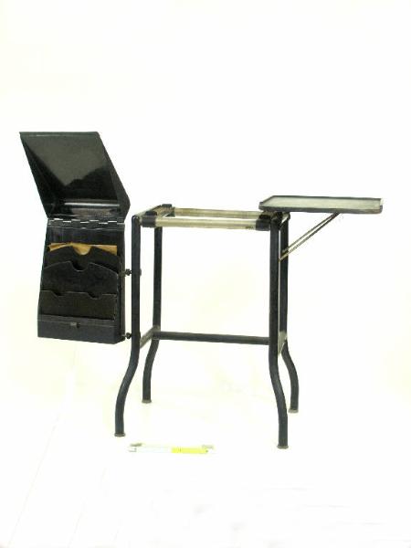 L'oggetto è costituito da una struttura in tubolare di ferro con due barre per l'aggancio della macchina da scrivere. Un pianetto a ribalta si può sollevare a destra, mentre un portacarte in lamiera a più tasche, protetto da un coperchio, è imperniato lungo la gamba sinistra