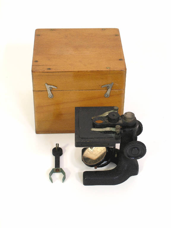 L'oggetto completo è costituito da uno stativo portalenti, un portaprovetta (?) e una cassetta di legno che raccoglie gli oggetti. Manca un accessorio per il quale esiste una sede sagomata nella cassetta. Lo stativo rappresenta il corpo principale del microscopio ed è formato da una solida base che ospita uno specchio per la riflessione della luce sul preparato. Il preparato da osservare si pone sul sovrastante tavolino portaoggetti, che tramite un'apertura riceve la luce proveniente dallo specchio.