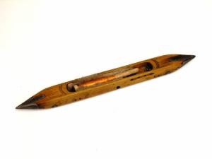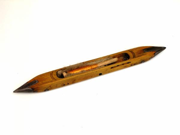 Lo strumento ha struttura in legno duro con al centro un incavo in cui alloggia la spoletta, sempre in legno, infilata in un apposito gancio sporgente dalla parete della navetta. Le due estremità sono rinforzate da punte in acciaio; un intero fianco dell'oggetto è rinforzato da una lamina d'ottone fissata con chiodi a testa levigata accuratamente. Sporgenti dalla faccia inferiore due rotelle del medesimo legno duro della navetta