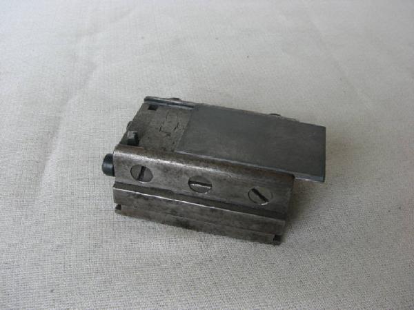 supporto semplice in acciaio con viterie di montaggio su macchina stampatrice a forma di parallelepipedo con faccia superiore dotata di incastro a slitta per l'inserimento di matrice completa