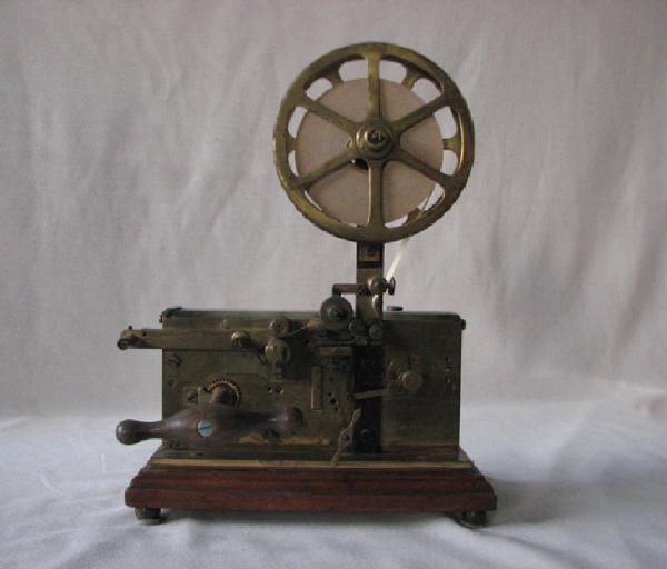 scatola a forma di parallelepipedo in ottone fissata su basamento in legno. Sulla superficie superiore sporge un asta che sorregge una bobina in ottone su cui è avvolto un rotolo di carta la cui estremità è inserita tra una serie di coppie di rullini che la trascinano guidandola.All'esterno , sulla faccia frontale, un'astina girevole con impugnatura ed altri meccanismi ad ingranaggi.Nella parte interna sono alloggiati i meccanismi di carica che si effettua con l'astina girevole esterna. Parte integrante è il tasto costituito da una basetta in legno su cui è montata una barretta in ottone incernierata a 3/4 della lunghezza su un supporto ed avente all'estremità del lato lungo un tasto o pulsante manipolatore e all'altra estremità una punta rivolta verso il basso che tocca una punta sottostante fissata alla basetta in legno.Da quest'ultima spuntano i morsetti in ottone per il collegamento elettrico con il circuito del telegrafo.
