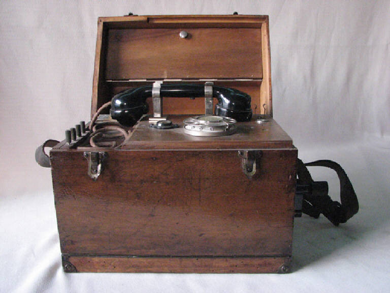 scatolato in legno con coperchio bloccato con due fermagli a ribaltamento.Sul lato destro una manovella girevole.Una cinghia puntata alle estremità per il trasporto a tracolla.\nSollevato il coperchio sul piano superiore è installato il disco combinatore,una lampada spia e due ganci per sorreggere la cornetta.All'interno un magnete permanente,una bobina di induzione, la suoneria,le batterie, il microtelefono.