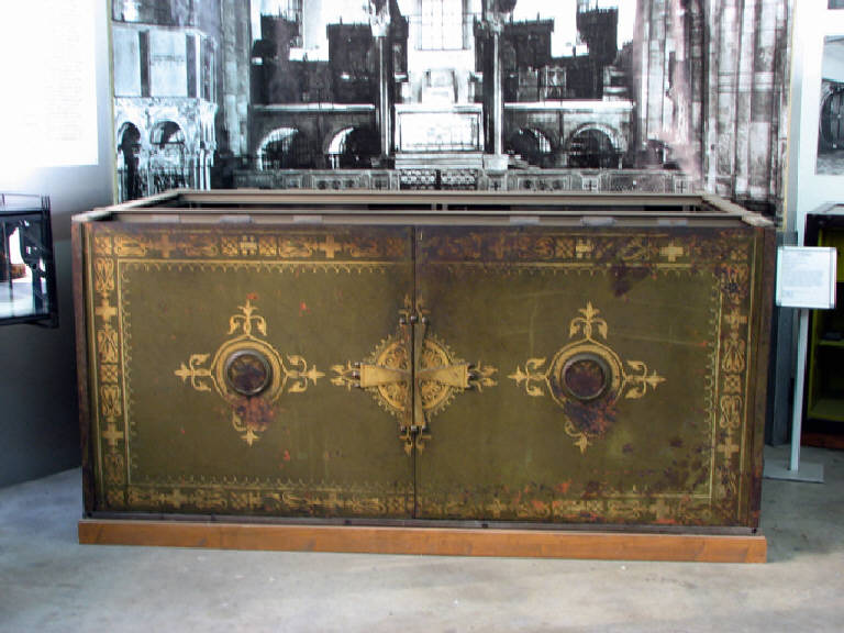 parallelepipedo a base rettangolare in lastre di acciaio , vuoto. senza base e senza coperchio. I lati lunghi sono composti da due ante battenti simmetriche ed i lati corti da un'anta ciascuno.Le ante sono imperniate su due telai,inferiore e superiore,resi solidali dagli stessi perni che permettono l'apertura dei battenti.Ogni battente è dotato di propri congegni di chiusura,comandati da una serratura azionata da due chiavi ,una a "pompa "ed una a mappa singola.I dadi che serrano i perni su cui scorrono le leve che provocano il movimento dei catenacci sono ricoperti da borchie in ottone a forma di fiore. In corrispondenza delle serrature,sulle pareti esterne,un disco d'acciaio , leggermente bombato, azionato da un congegno meccanico nascosto che ne provoca la rotazione ,nasconde i fori di introduzione delle chiavi.I leverismi ed i meccanismi di chiusura,alloggiati sulla faccia interna delle pareti,sono in acciaio lucido ( probabilmente temperato ) e molto ben conservato. Le ante a vista sono verniciate a fondo verde cupo e finemente decorate in oro a motivi circolari e floreali attorno alle serrature e con tondo sormontato da una croce al centro della parete facciale.Altri motivi a croci e floreali lungo i contorni .Le ante presentano tracce di abrasione e macchie di ruggine.Le meglio conservate sono le due ante frontali,probabilmente perchè sottoposte nel tempo a più costante ed accurata manutenzione,in quanto più esposte alla vista dei fedeli e dei visitatori.
